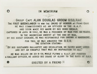 Alan Douglas Groom (1913-1956) grew up in the Brisbane suburb of Auchenflower; he attended Toowong State Primary School and Brisbane Boys Grammar School before studying engineering at the University of Queensland. He next attended the Central Flying School, at Point Cook, Victoria. Groom left Australia in January 1935 to serve in England with the RAF, reaching the rank of Wing Commander by 1940. He was posted to the Far Eastern Command as Officer-in-Charge of 153 Maintenance Unit, stationed in Singapore. In January 1942 after the fall of Singapore he was posted to Java in the Dutch East Indies and shortly after became a prisoner-of-war of the Japanese. Between March 1942 and September 1945 he was held in various prison camps and jails.