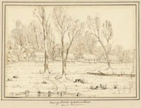 Partial (disbound) folio containing three sepia and wash drawings as follows: 'Eton Vale Looking Towards The Range Darling Downs"; "Men's Huts, Moray Fields Cabulture River [sic] Oct 31st 1868"; "From the Verandah, Montpellier House. Brisbane". Vacant spaces in the folio mark the original locations of five other sepia and wash drawings, removed and now located in Box 17690 O/S. (Removed items as follows: "Westbrook. Darling Downs.Queensland. (January 8th 1869"; "Westbrook & Mr MacLean's [sic] Monument."; "Eton Vale, from the hill behind."; "Goomburra, fm the House. Darling Downs."; "Goomburra, looking to the House.") Also three loose pencil sketches (one of Queensland) and two engravings of European scenes.