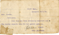 This series of letters includes correspondence from William Stevensen who was serving with the 11th Field Artillery Brigade, a friend of the Ingham family; formal correspondence from the Australian Military Forces, and unmatched envelopes retained by the family.