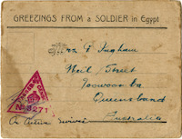Greeting card from William Ingham to his mother, sent from Egypt, on active service, it includes a poem titled 'Loving Greeting to my dear Mother'.
