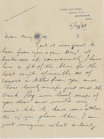 Letters in this series are chiefly from Charles Fry who was serving with the Royal Air Force (RAF) in England and the Middle East prior to the war with Germany. Posted to the re-formed 112 Squadron which was initially based at RAF Helwan, Cairo, and later over the Sudan, he was promoted to Flight Lieutenant. In November Charles proposed to Beryl Smith and sent her a cheque to buy an engagement ring; she accepted his offer.