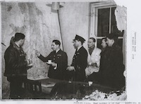 Photograph of the Operations Room, R.A.F. Station, Biggin Hill, Kent, England. One of the men pictured is Flying Officer Charles Horace Fry in R.A.F. uniform.