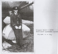 Photograph showing Charles Fry at R.A.F. Station, Biggin Hill, Kent, standing in front of a Westland Lysander aircraft. It is captioned "They call me Digger".