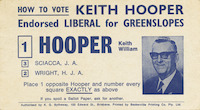 Handwritten recipe for 'Little Cakes' noted on the back of a Liberal ballot card. The recipe was originally devised by Betty Florence Hooper (nee Ball) who married Keith Hooper in 1947. The how-to-vote ballot card was for Keith Hooper, the then candidate for Greenslopes, a seat he held from 1966 until his resignation and death in 1977.