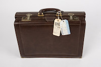 Sir Joh Bjelke-Petersen's brown leather briefcase [empty] still with baggage tags attached for a flight on Ansett Australia Airlines, Brisbane to Melbourne [no date].