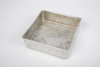 Silver aluminium square cake tin 230 x 230 x 70 mm high, used and dented.