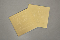 Coasters commemorating the Holland Park Jubilee 1985. Two gold, embossed, square coasters, felt backed, 95 x 95 mm, featuring the emblem for the Uniting Church, an open book and the numbers 50.