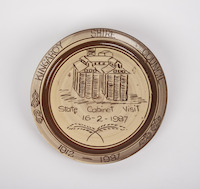 Earthenware plate issued to commemorate the Kingaroy Shire Council, State Cabinet visit, decorated with a stylised image of the Kingaroy peanut silos.