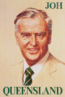 Sir Joh Bjelke-Petersen's 1983 campaign poster, copies of which were later sold to raise funds for the 'Help Joh Campaign' in 1991. Printed with the words 'Joh and Queensland', it reflects the patriotic colours of Australia, green and gold.
