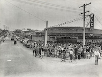 - crowds inside and outside the Brisbane Cash and Carry store in the Chermside Drive In Shopping Centre for opening day, 31 May 1957, as well as footage of shoppers in other areas of the centre.