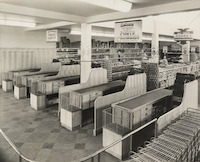 - photographs of customers being served at checkouts by 'girls in blue', one with men assisting; photographs of the interior of the shop with shelves full ready for shoppers; photographs of shoppers crowding the shop front; 2 photographs of a mother shopping with her child; photograph of a Cash and Carry staff member loading groceries into the boot of a customer's car at the Brisbane Cash and Carry (BCC) car order pick up point; Cash and Carry staff member loading a conveyor belt; Cash and Carry carpark; photographs of exterior views of the building; photographs of customers shopping.