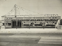 - photograph of the shopfront; photograph of shoppers crowding the decorated shop front with a ute out front with a band in the tray sporting the sign 'Follow the band to the new B.C.C. super food market Toowoomba opening today 9.15 a.m'; photographs of the decorated shop front at night; photographs of the interior of the shop with shelves full ready for shoppers, some with decorations.