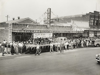 - crowds and the Brisbane Cash and Carry ute with a band in the tray outside the Toowoomba store on opening day, 1950s.