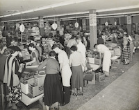 - crowds outside and inside a Brisbane Cash and Carry store on opening day as well as footage of Brisbane Cash and Carry 'girls in blue' serving customers.