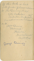 This series contains two school exercise books retained by the Deviney Family relating to George Deviney and his sister Mary. Also included is a note by Fae Collins Deviney who was the niece of George Deviney and the custodian of the collection before it was donated to the State Library.