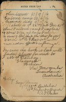 Small diary kept by George Deviney. The entries recount his training in Brisbane, the journey to Sydney to board the transport ship "Ayrshire", the journey to England, training at Codford Camp in Salisbury, the journey to France, life in the trenches, being wounded in the leg from shrapnel, suffering from the effects of gas and being sick from influenza..
