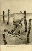 The postcard features the caption "Gott strafe this barbed wire" and is part of the series "Bystanders" Fragments from France, Series 4. Illustrated by Bruce Bairnsfather.