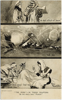 The postcard featuring a military cartoon, entitled "The Push - in three chapters, by one who's been pushed" and is part of the series "Bystanders", Fragments from France, Series 4. Illustrated by Bruce Bairnsfather.