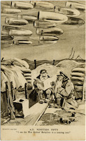 The postcard featuring a military cartoon, entitled "My Dug-Out, a Lay of the Trenches" and is part of the series "Bystanders", Fragments from France, Series 4. Illustrated by Bruce Bairnsfather.