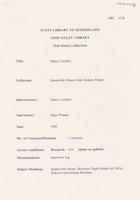 Interview with Nancy Lockley who discusses a wide range of subjects including teachers, class sizes, book inspections, assemblies, religions, education, excursions, the boarding house, opening of the 'new' library, uniforms, St Laurence's College, scholastic subjects, staff room duties, teachers' salaries, Old Girls' Association, and the Friendship Network. The interviewer is Gaye Pitman.
