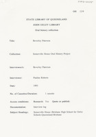 Interview with Beverley Paterson who discusses the long train journey to Stanthorpe and the life there as a student. She recalls how Miss Craig (headmistress) commuted from Brisbane to Stanthorpe each week by train. Miss Ruth George and Miss Ina Morgan were in charge of the two Brisbane branches of the school during those years. The interviewer is Pauline Roberts.