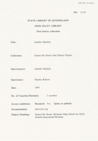 Interview with Jennifer Macklin who discusses her teachers and colleagues including Misses Potter, Taylor, Godfrey, North, Cook, Andrews, Gray, Mrs McNamara, and Mr Wells, the first headmaster of Somerville. Jennifer reminisces about various aspects of school life. Among those memories are etiquette classes, rules about hats and gloves, teachers wanting to wear slacks, warnings regarding St Laurence's boys and the Junior and Senior Examinations. The interviewer is Pauline Roberts.