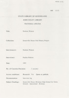 Interview with Noeleen Watson who discusses her father, Sister Elizabeth Kenny, teachers, book inspections, uniforms, air-raid shelters and knitting for the troops. She also discusses her teaching career including wages, working conditions and supervising boarders. The interviewer is Pauline Roberts.