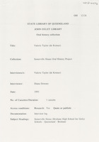 Interview with Valerie Taylor who discusses attending Rockhampton Girls Grammar and then Somerville, uniforms, the boarding house, meals, Sunday church services, detention, clothing allowance, music practice, teachers, comparisons with her teaching career at Clayfield College compared to being a pupil at Somerville, youth concerts and school dances. The interviewer is Diana Downes.