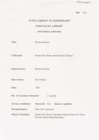 Interview with Norma Horton who discusses her childhood, school days and teaching career at St Gabriel's in Charters Towers and Sommerville House. Norma also discusses the Somerville House philosophy and religious practices. The interviewer is Sue Pechey.