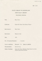 Interview with Mary Davis who discusses being a new teacher at Somerville House from 1957-1958, returning to the school as the Chaplain's wife and taking the position as Senior Boarding Mistress during 1986-1991. The interviewer is Maureen Cook.